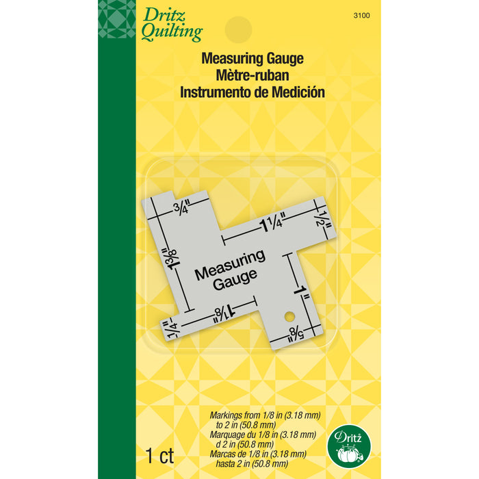 Take exact measurements of small items while sewing or quilting with the Dritz Measuring Gauge. This handy aluminum gauge indicates 14 functional measurements and features clear black markings from 1/8 to 2 inches on both the sides. Use it to mark precise locations of hems, buttons, appliques and other dainty embellishments on fabrics or craft projects. The gauge is compact in size and can easily slip into your handbag or sewing kit.