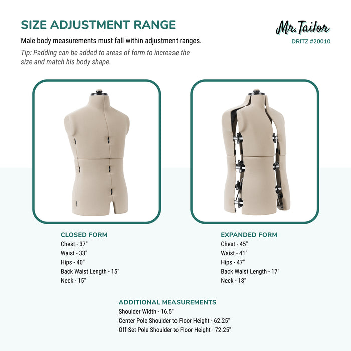 The Dritz Mr. Tailor adjustable male form has a unique design and special features to assist you when tailoring and altering men's pants as well as shirts and jackets.