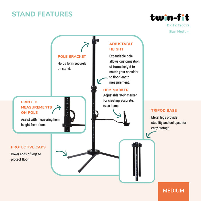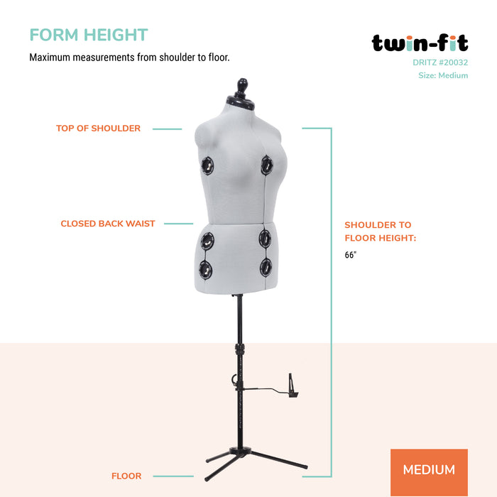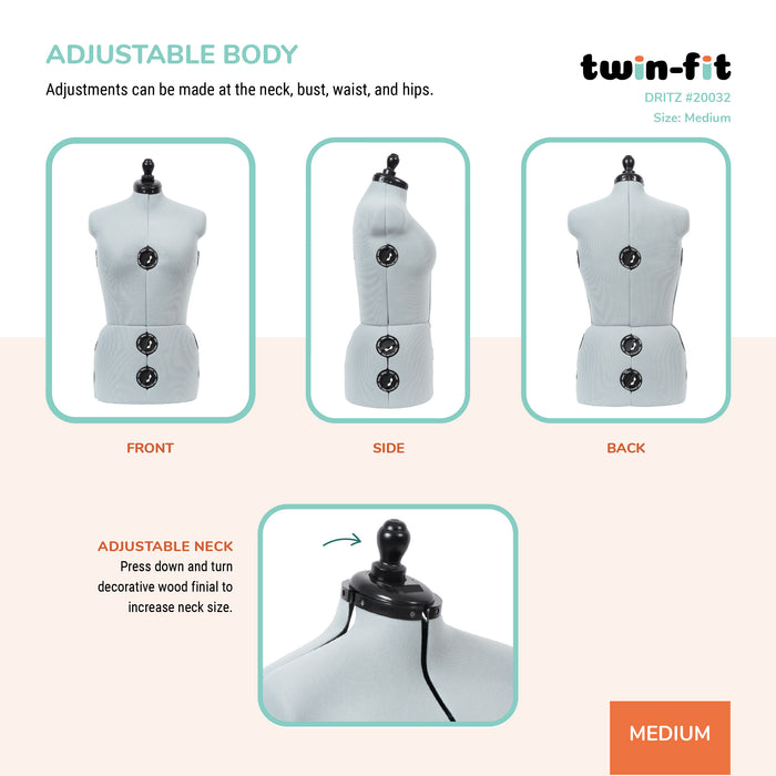 The Dritz Twin-Fit dress forms provide the seamstress with a body twin that matches their body size and assists with the fitting, construction, and alterations of garments. The forms fabric is a silver gray color with polyester fabric and foam backing for easy pinning and marking when making fitting, construction, and garment alterations.
