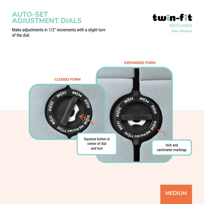 - 12 auto-set dials include inches and metric and adjust in ½” increments by squeezing and turning dials