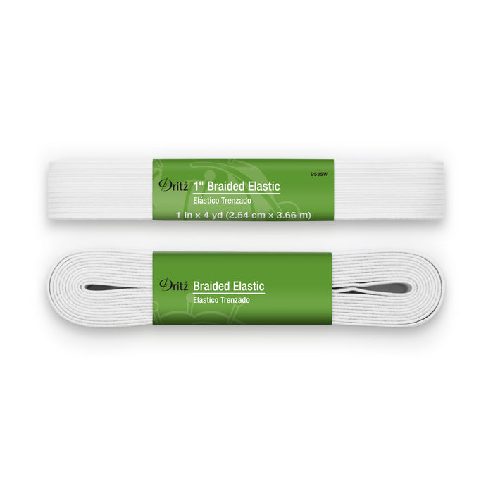Dritz Braided Elastic is the most basic elastic. It is lightweight, slightly ribbed and it narrows when stretched. It is most often used on necklines, sleeves, waistbands and swimwear waistbands and leg bands.