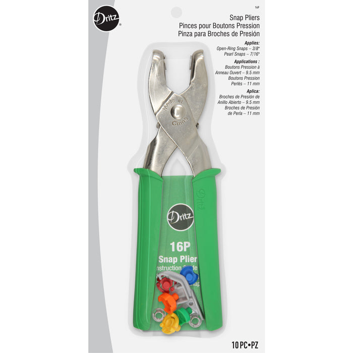 Dritz snap fastener pliers are used to apply functional snap fasteners to a variety of DIY sewing and repair projects such as children's wear, blouses and shirts.
