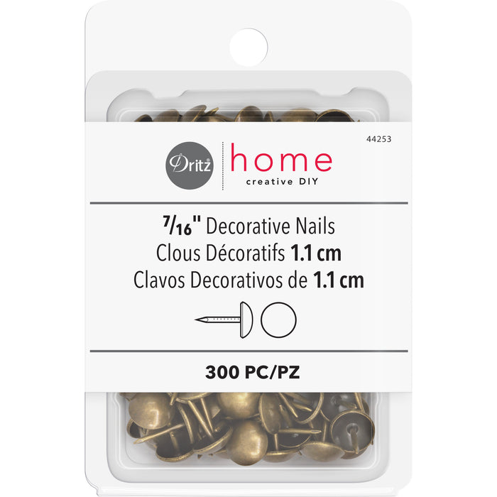 Accentuate your living space with the Dritz Home Smooth Decorative Nail 300 PC box set. Use to add pattern and dimension to upholstered chairs, ottomans or headboards. Use nails alone or mix with other Dritz Home decorative nail styles to create visual interest. Ideal for large projects and DIY upholstery and craft enthusiasts. The 7/16-inch diameter nailhead with smooth surface texture comes in an Antique Brass Color. Always use safety glasses and proper tools to drive and remove this product.