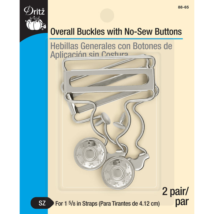 Dritz overall buckles with no-sew buttons are ideal fasteners for both apparel and accessories. Use for DIY sewing projects as well as repairing, replacing or adding buckles to store-bought garments. This package contains 2 no sew buttons and 2 buckles for 1-5/8" wide straps in gilt finish.