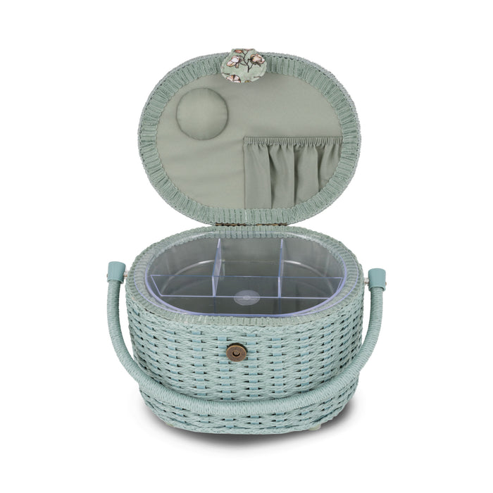 A Dritz sewing basket is an attractive, portable way to organize essential sewing, quilting or craft supplies. The pretty, soft green floral print on the basket lid is accented with coordinating green cord trim. The perfect size to keep basic supplies close at hand.