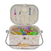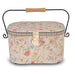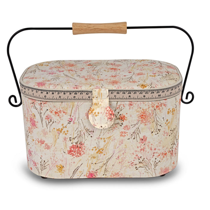 This large oval sewing basket features a charming floral spray print in soft neutral colors with a hint of gold. The basket is accented with a tape measure trim and curvy black metal handle with wood trim. A Dritz sewing basket is an attractive, portable solution for storing and organizing essential sewing, quilting or craft supplies.